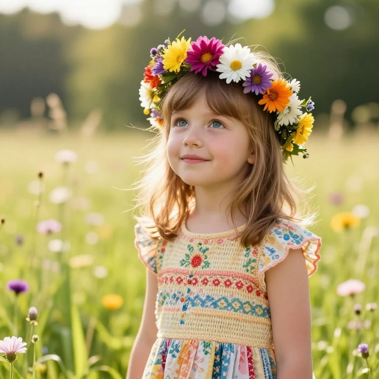 A beautiful young girl stands in a sunny meadow, dressed in a vibrant yellow dress that flows gently in the wind. She has soft, curly brown hair, and a delicate flower crown made of fresh blossoms rests gently on her head. The sunlight glows warmly around her, casting a golden hue on her skin and the surrounding wildflowers. Her expression is joyful and serene, with a soft smile, as she looks toward the horizon, surrounded by a peaceful, natural landscape.