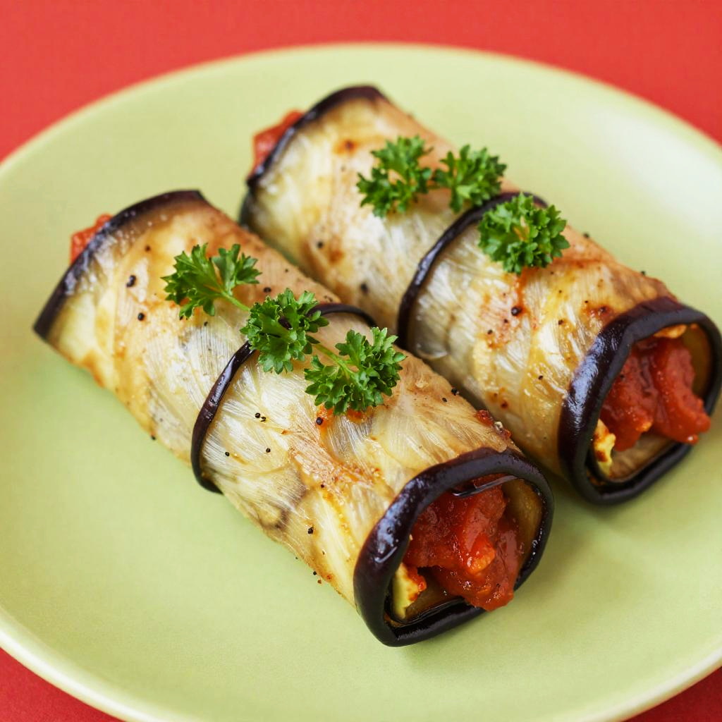 This is a close-up photo of stuffed eggplant rolls on a bright green plate. The eggplant is sliced into thick rounds, wrapped with black eggplant slices and garnished with fresh parsley. Inside, there's a visible red tomato sauce. The background is a vibrant red, making the colors pop. The photo has a slightly blurred, high-contrast effect.