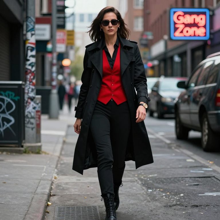 Photorealistic scene of a female gangster in a sleek, modern female gangster outfit — a sharp black trench coat, combat boots, a crimson vest, and a vintage watch — walking through a gritty urban street with graffiti, parked cars, and a neon-lit sign reading 'Gang Zone', her face expression calm yet powerful, eyes reflecting street intelligence and street pride.