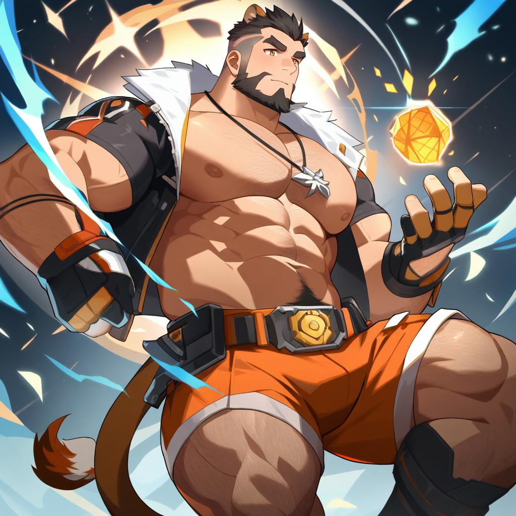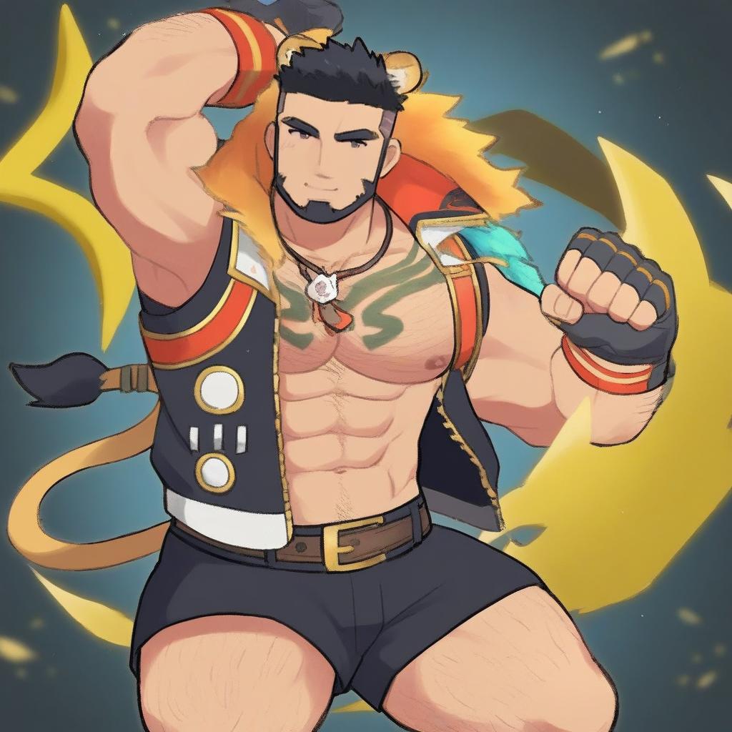 Alca (wakatanka4), gyee, 1boy, lion boy, mature male, lion ears, beard, lion tail, extra ears, red eyes, thick eyebrows, short hair, black hair, navel hair, chest hair, leg hair, chest tattoo, nipples, thick thighs, navel, necklace, bara, muscular male, large pectorals, abs, undercut, sideburns, stomach, by artist kaigen 1025, animagine