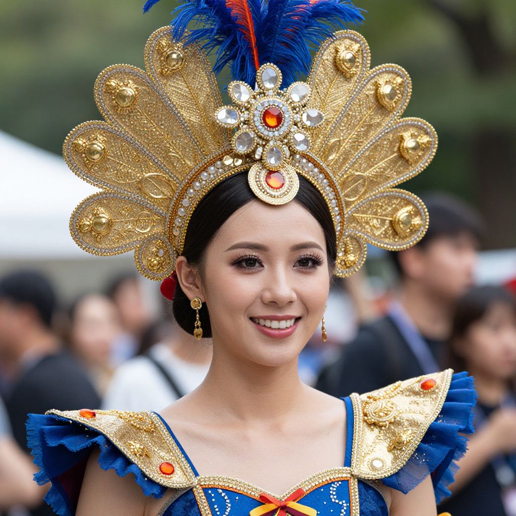 Masskara Festival Dress Costume, a close up of a woman in a costume with a large headdress