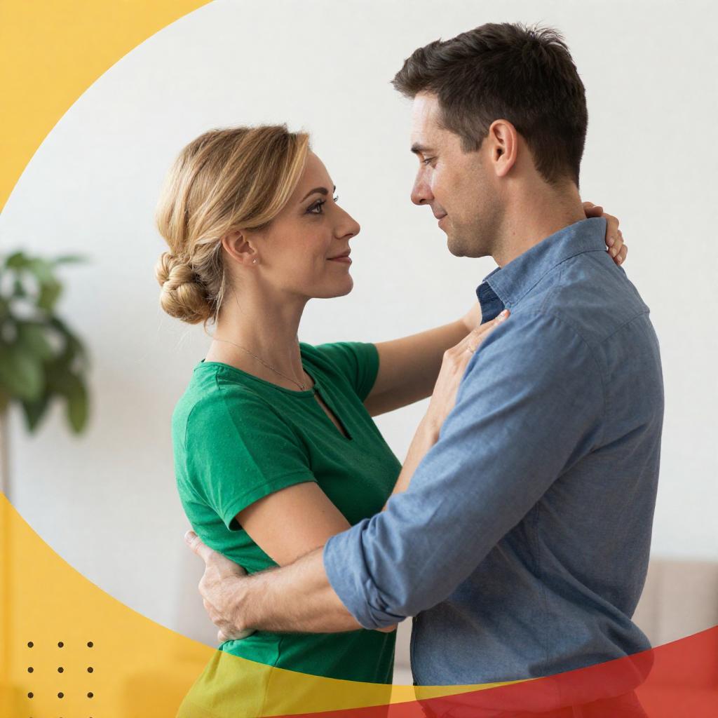 Photograph of a blonde woman in a green top, gently embracing a dark-haired man in a blue shirt, facing each other intimately, with a bright