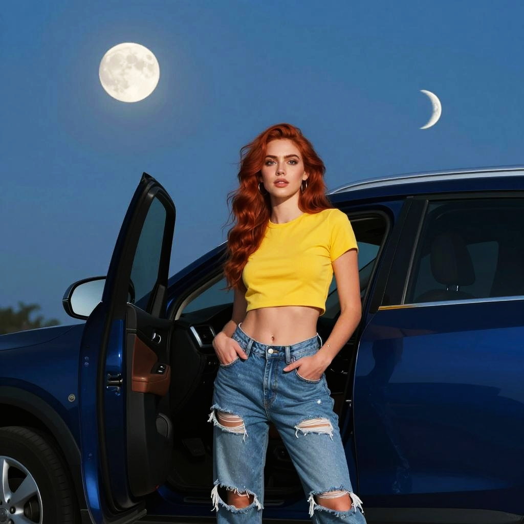 A confident red-haired woman poses in front of a dark blue car with an open door under a clear night sky illuminated by a full moon and a crescent moon. She is wearing a yellow cropped top and ripped blue jeans, striking a bold stance with her hands in her pockets.