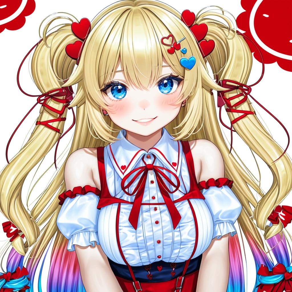 Digital illustration of a blonde anime virtual YouTuber with very long hair styled in two side-up ponytails. She has bright blue eyes and is wearing a white blouse with red ribbons and heart-themed hair accessories. The image features vibrant colors, detailed shading, and a cheerful facial expression.
