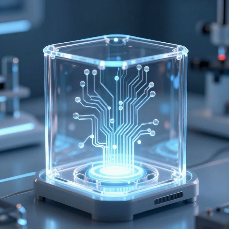 Transparent material glowing softly in a futuristic lab setting, showcasing intricate internal circuitry, with a sleek, minimalist design and blue ambient lighting, detailed macro shot, high-resolution digital art style