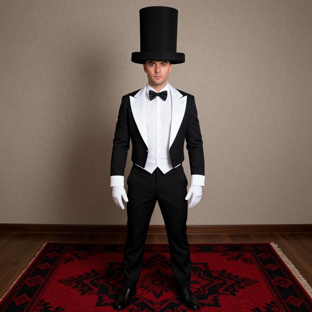 Man Top Costume Hat Black, man in a black and white costume standing on a red and black rug