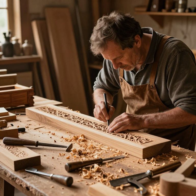 Photograph of an elderly, bearded woodworker in a brown apron, meticulously carving intricate patterns on a wooden panel in a sunlit workshop.