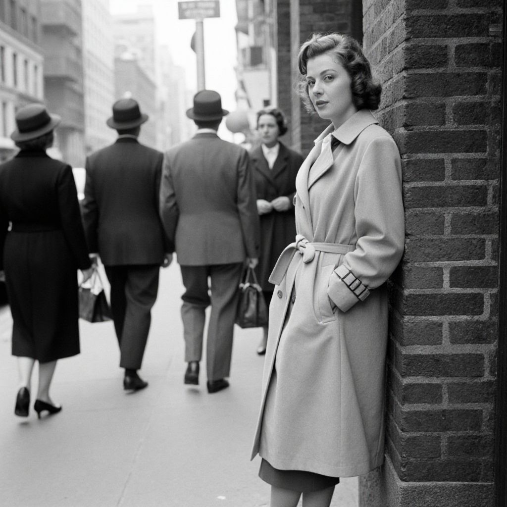 This black-and-white photograph captures a 1940s urban street scene. In the foreground, a fair-skinned woman with wavy, shoulder-length dark hair stands leaning against a brick wall. She wears a light-colored, belted trench coat with pockets visible, and gazes thoughtfully to the side. In the background, several people walk down the street, including men in suits and women in hats and coats, some carrying handbags. The street is lined with tall buildings, and the image has a nostalgic, vintage feel, with sharp contrasts and high-contrast lighting. The woman's expression and posture suggest a moment of contemplation amidst a bustling city atmosphere.