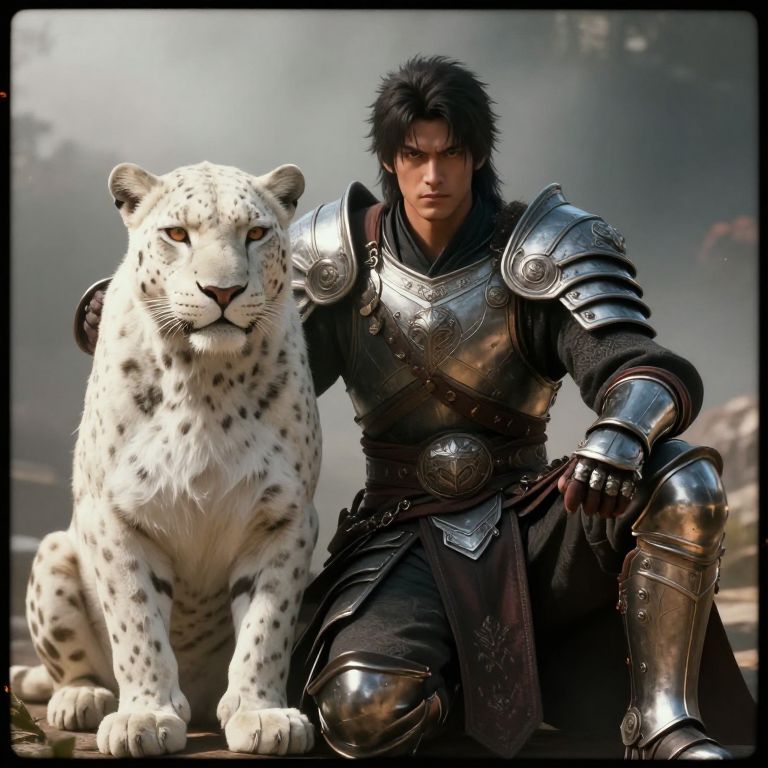 In this 3D game artwork, a male warrior, dressed in heavy armor, sits next to a majestic white leopard. The warrior, who appears to be 22 years old, exudes a fierce presence with his manly face and intense eyes. He is adorned in intricate, detailed armor that reflects the light, creating a dramatic and cinematic effect. The white leopard, with its striking orange eyes, sits calmly beside him, adding a sense of balance to the composition. The scene is bathed in ethereal light, with a film burn effect and grainy texture reminiscent of an old Kodak photo, enhancing the dramatic atmosphere. The background is shrouded in fog, adding depth and a sense of mystery to the scene. The overall composition is carefully arranged, with the warrior and leopard positioned in the foreground, creating a focal point that draws the viewer's attention. The use of volumetric lighting and ambient occlusion adds a layer of realism, making the scene appear as if it were captured in a photograph. The intricate details of the armor and the leopard's fur are rendered with precision, showcasing the artist's skill in creating a visually stunning and immersive experience.