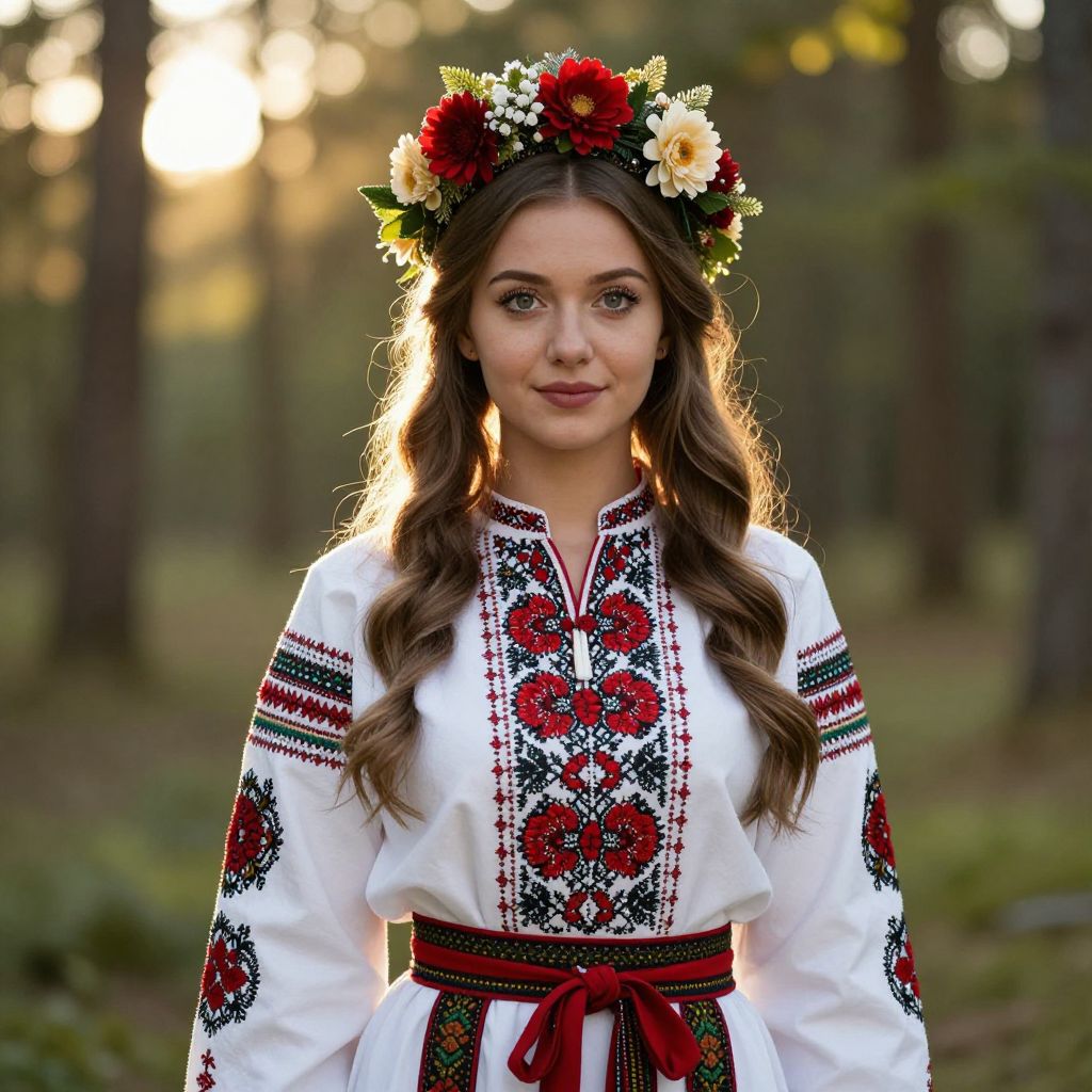 A stunning digital illustration depicts a young woman adorned in traditional Ukrainian ethnic attire, featuring intricate embroidery and vibrant red accents, complemented by a floral crown and set against a serene forest backdrop during golden hour lighting.