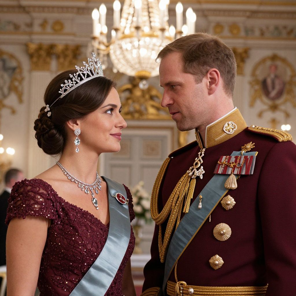 Elegantly attired royal figures share an intimate moment, with the man in a regal maroon uniform adorned with gold embellishments and the woman wearing a shimmering tiara and diamond jewelry, set against the opulent backdrop of a grand chandelier-lit room.