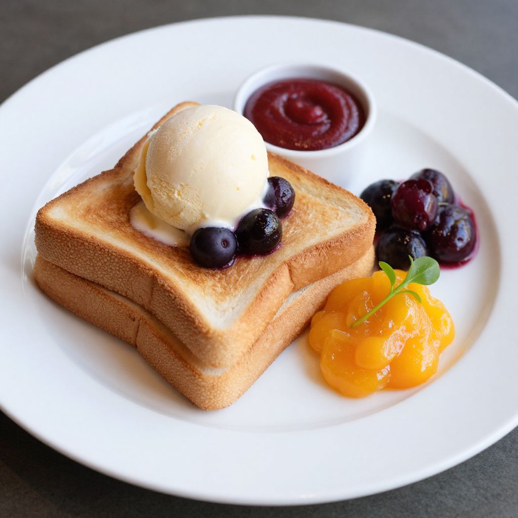Delicious breakfast spread featuring golden-brown toast stacked neatly, topped with a scoop of creamy vanilla ice cream and dark berries, accompanied by a vibrant orange marmalade jelly garnished with a green sprig, and a small container of rich red sauce, all presented elegantly on a pristine white plate at The Hertford Hotel.