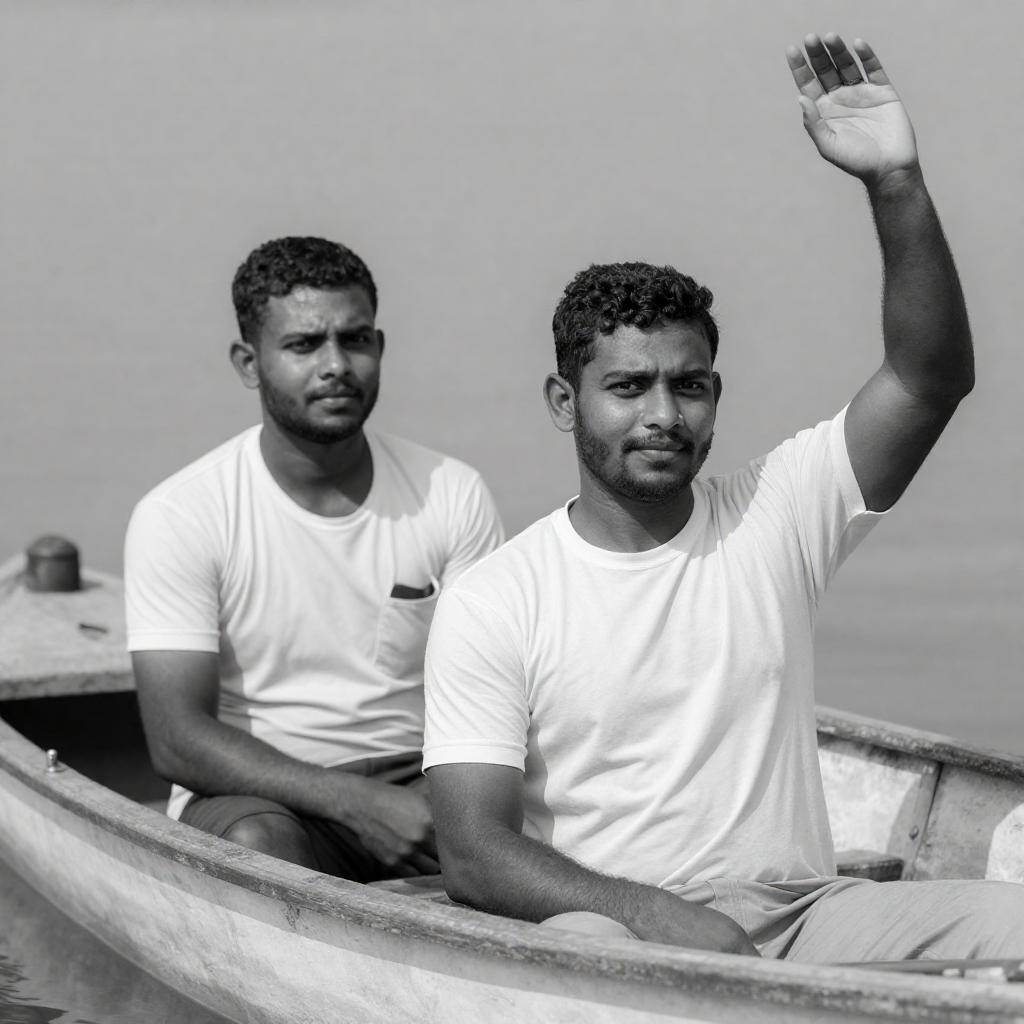 Black-and-white photograph of two men in a small boat. Both wear white shirts; the man on the right raises his arm. The boat's edge and water are visible in the background. The man on the left looks forward, while the man on the right gazes slightly to the side.