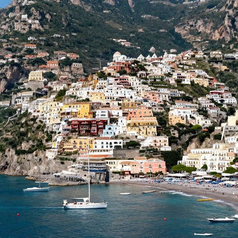 Amalfi's vibrant coastal town unfolds in a cascade of colorful buildings perched atop rugged cliffs, with sailboats and yachts gently dotting the azure waters below, offering a serene and picturesque seascape.