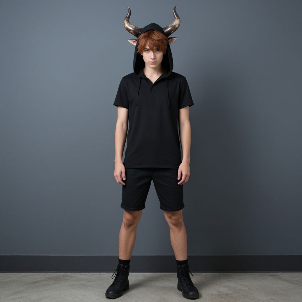 Photograph of a young Caucasian male standing against a plain gray backdrop. He has light skin, brown hair, and wears a black hoodie with the hood up, featuring large, silver-colored, curved horns on top. His outfit includes black shorts and black ankle boots. He stands with a neutral expression, arms relaxed at his sides. The floor is gray concrete, and the overall mood is minimalist and edgy. The lighting is even, emphasizing the simplicity and contrast of the black clothing against the gray background.