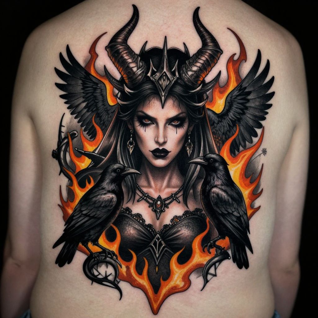 Evil woman tattoo featuring a dark queen with sharp features, crowned with twisted horns, surrounded by ravens and fiery embers, strong emphasis on shadows and highlights, dramatic and intense gothic tattoo style illustration