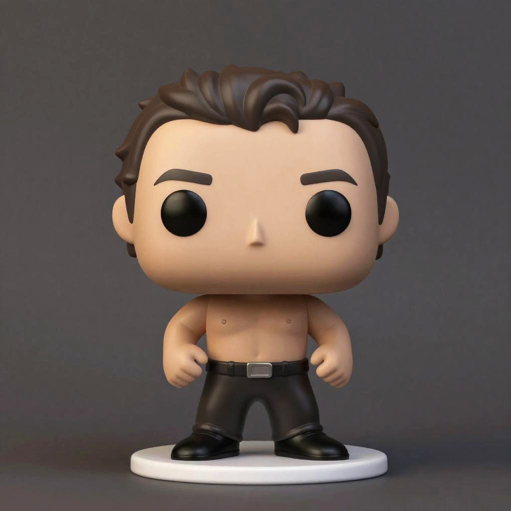 Obj Funko Pop inspired character with exaggerated proportions, detailed sculpting, and glossy finish, standing in a playful pose on a simple pedestal, surrounded by soft ambient lighting to emphasize the figure's features.