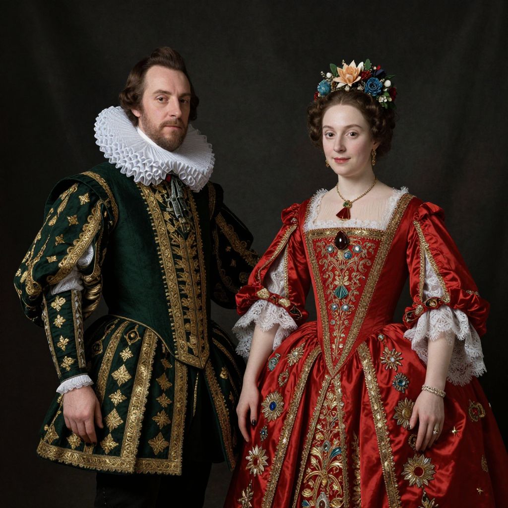 Sixteenth-century noble couple depicted in opulent attire, the man wearing a dark green doublet adorned with gold embroidery and a white ruff collar, while the woman dons a rich red gown embellished with intricate lace details and a floral headdress, both exuding regal elegance against a dark, draped backdrop.