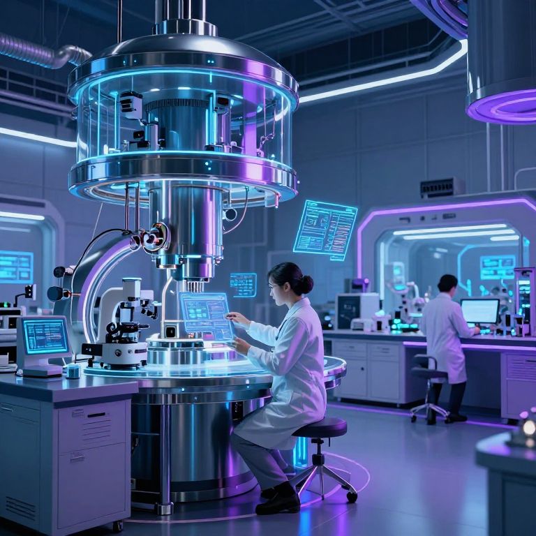 Photograph of a futuristic laboratory with a blue and purple neon light theme. A woman with dark hair in a white lab coat and black pants sits at a desk, interacting with holographic screens floating around a large, cylindrical, metallic machine. In the background, another person in a white lab coat stands near various computer monitors. The room has sleek, modern furniture and industrial ceiling pipes. The overall atmosphere is high-tech and scientific.