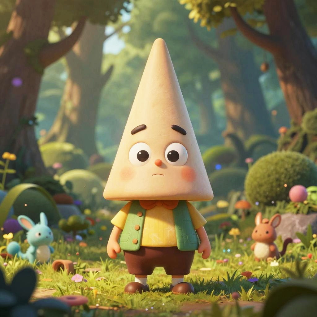 Whimsical conehead cartoon figure wearing colorful clothes, standing in a lush enchanted forest, oversized head shaped like a cone, playful expression, fantasy theme with magical creatures and soft lighting, storybook illustration style.