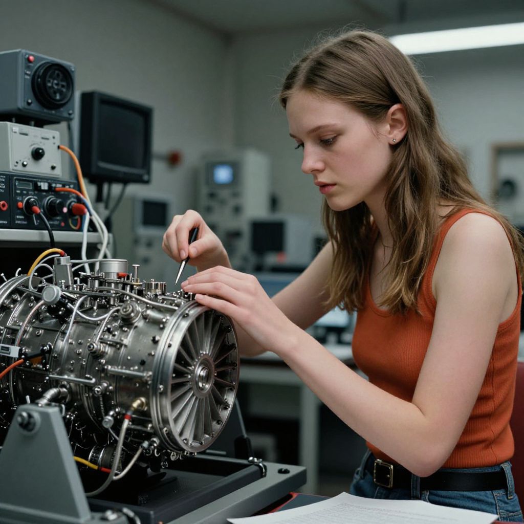 In this photograph, a young Caucasian woman with fair skin and long brown hair, wearing a sleeveless, burnt-orange ribbed tank top and blue jeans, works on a complex, silver engine in a brightly lit, industrial workshop. She is focused, using both hands to adjust the engine's components. The background features various technical equipment, including monitors and control units, mounted on a gray wall. The engine, prominently positioned in the foreground, showcases intricate metal parts and wires. The woman's expression is concentrated, and a white sheet of paper with blue ink is visible on a table in front of her.