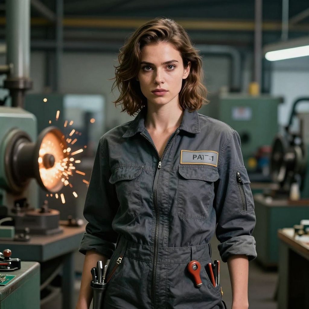 Artificial Intelligence photography by Annie Leibovitz, film still/ a young top model girl working on a super detailed infinite engine with plenty of devices /style by David Fincher/32k — q 2,