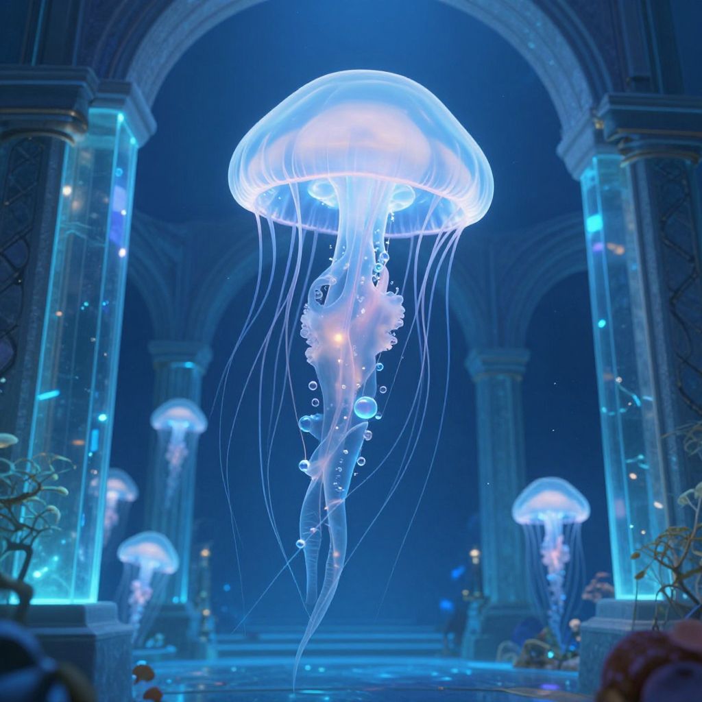 Giant, translucent jellyfish with bioluminescent hues drift gracefully through an ethereal underwater cityscape of glassy columns and stone arches, illuminated by a serene blue glow that enhances their otherworldly beauty and evokes a sense of forgotten, poetic elegance.