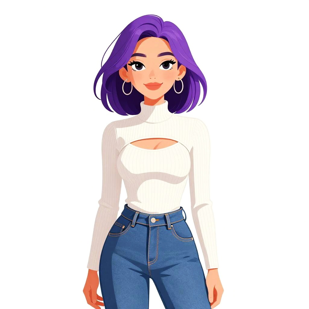 Woman with pretty face and pretty hair. smiling Woman, contemporary casual, white ribbed knit bodysuit with turtleneck and chest cut-out, long sleeve, high-waisted blue denim jeans with paper bag waist, studio background with white backdrop. --sref 1467