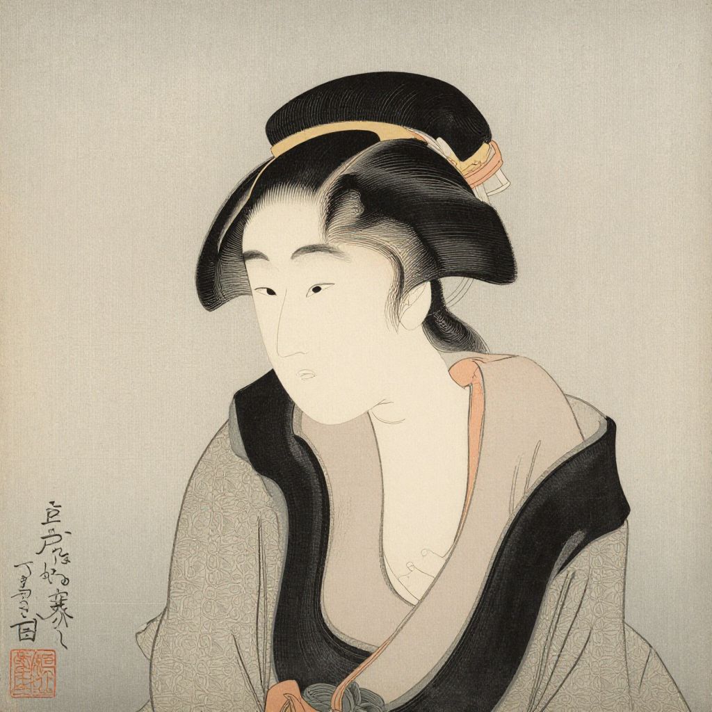 Traditional Japanese woodblock print of a serene woman with black hair in an updo, wearing a gray kimono with black and orange accents. Text in