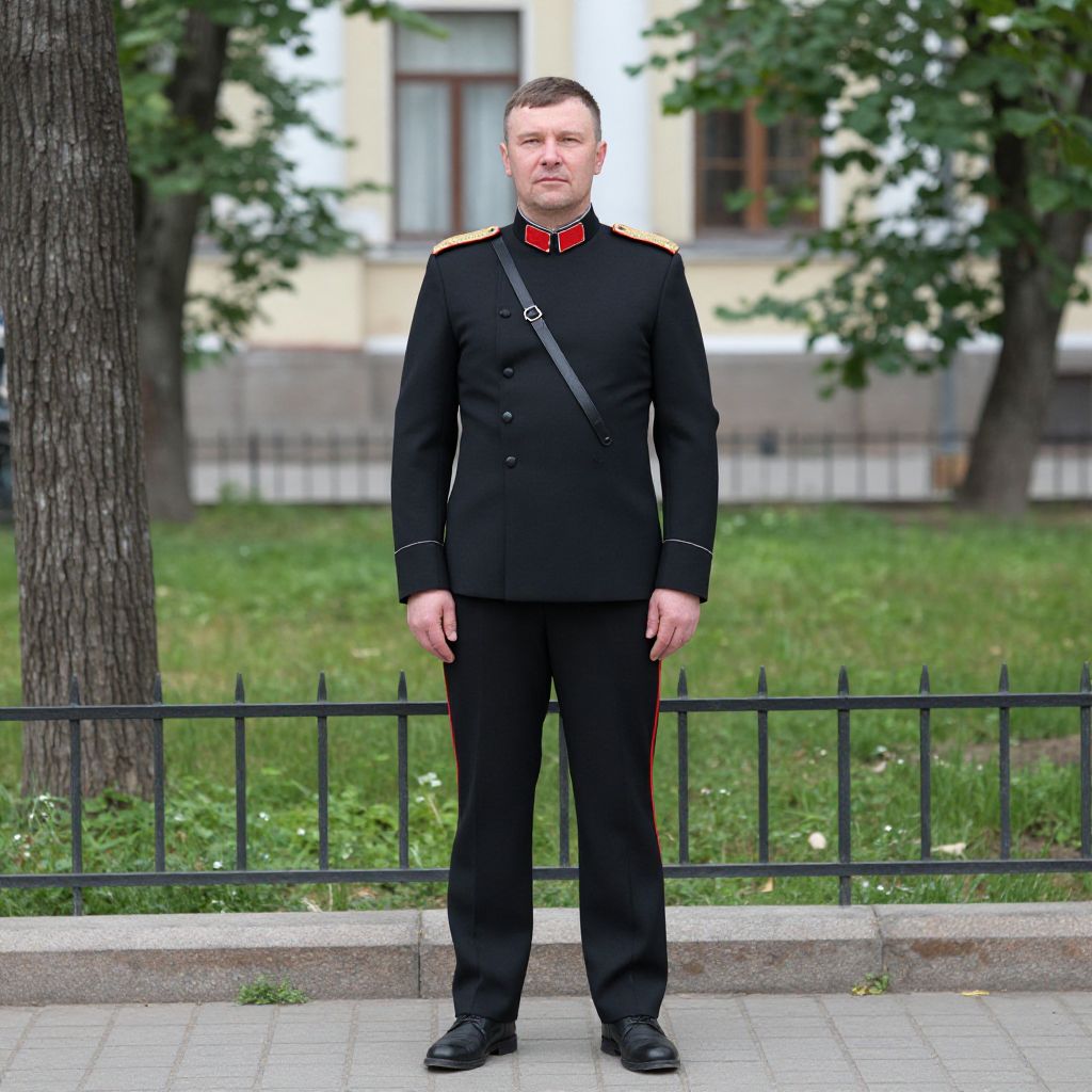 Photograph of a middle-aged Caucasian man with short brown hair, standing in a park. He is dressed in a black military-style uniform with red and black striped collar, black trousers, and black shoes. A black diagonal strap crosses his chest. The background features green grass, a black metal fence, and tall trees with white flowers. A white building with brown-framed windows is visible in the distance. The man stands on a grey paved path, looking directly at the camera with a neutral expression. The image is brightly lit with natural daylight.