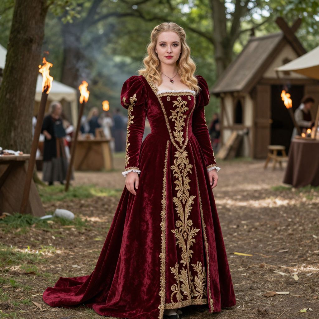 Photograph of a blonde woman in a rich, burgundy velvet gown with gold embroidery, standing in a forested medieval fairground.