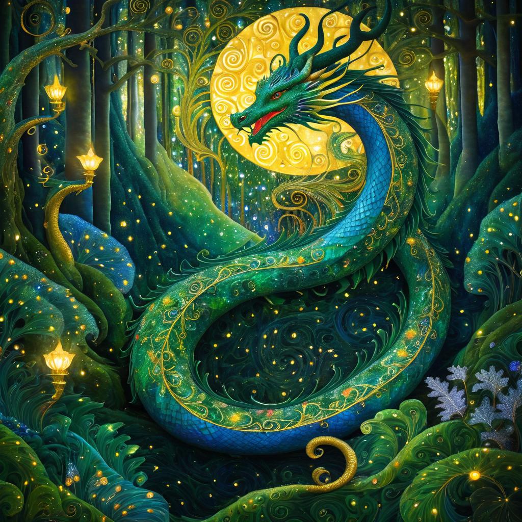 Highly detailed painting of a majestic green dragon with golden ornamental patterns and white scales, set in a mystical forest illuminated by small glowing orbs. The style is inspired by Gustav Klimt and Renaissance lighting techniques, emphasizing rich textures and vibrant colors in a fantastical setting.
