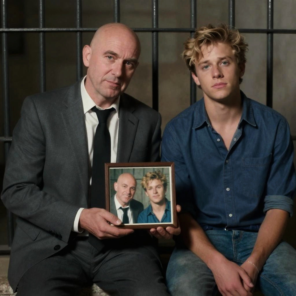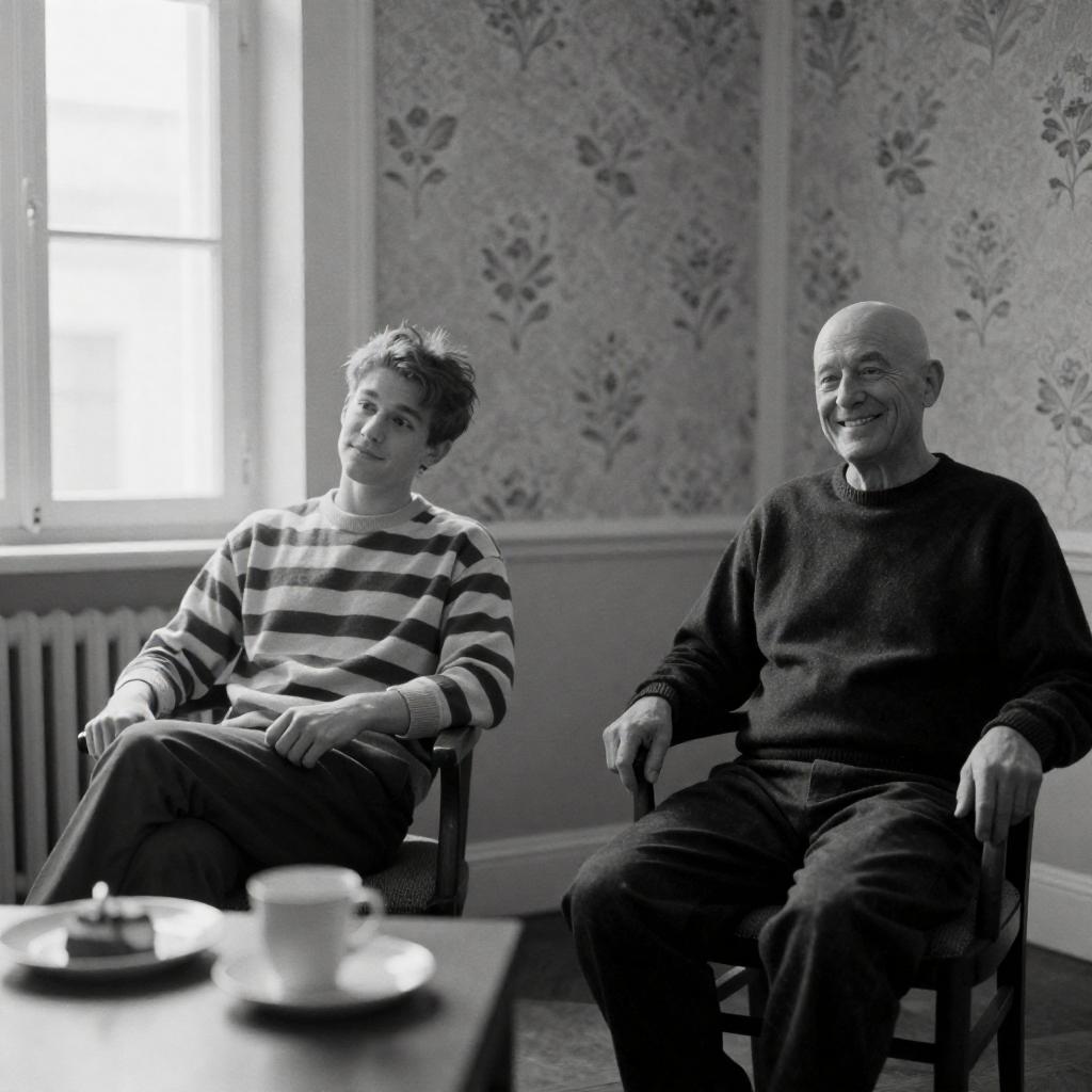 Black and white photograph of two men in a room with floral wallpaper. Young man with short hair, relaxed pose, leaning back in chair, wearing striped sweater. Older man, bald, smiling, sitting upright, wearing dark sweater, holding armrest. Two wooden chairs, small table with plates and cups in foreground. Bright light from window on left.