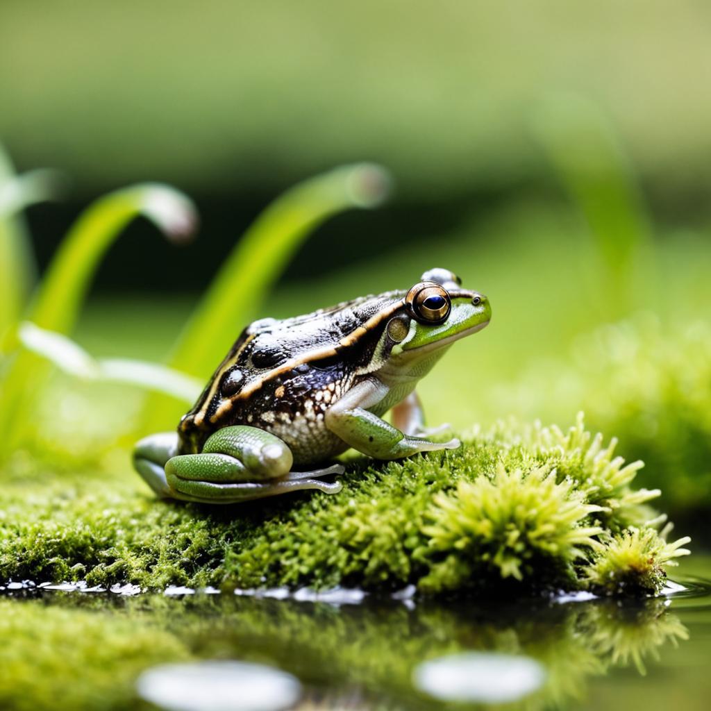 No humans, blurry, animal focus, animal, realistic, frog, blurry background, outdoors, depth of field, solo, lizard, full body, water, nature, black eyes, snail, grass, day, oversized animal, moss