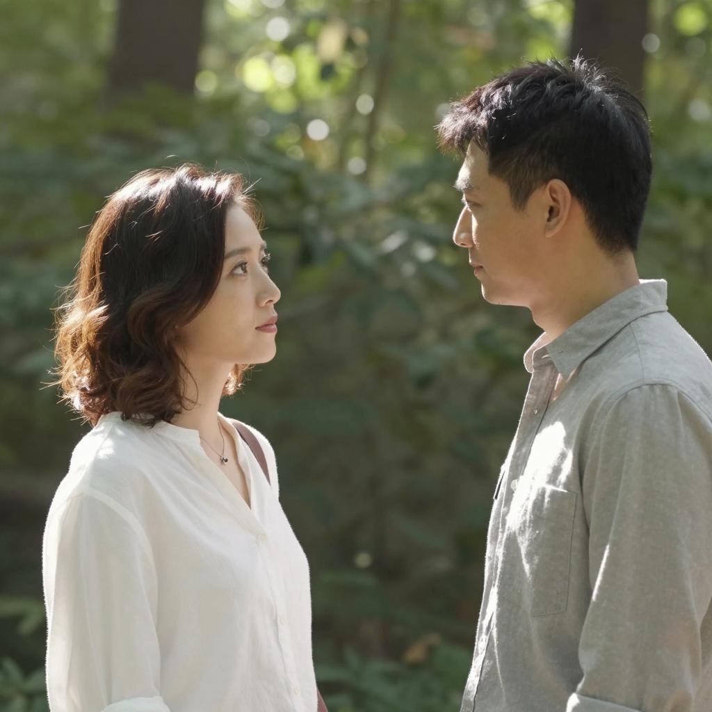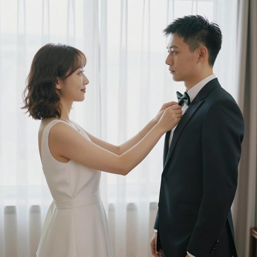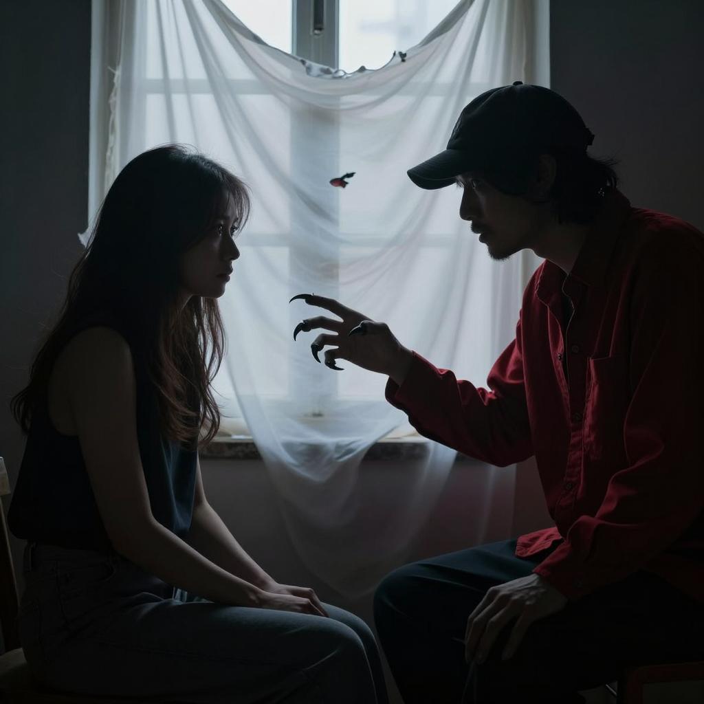 Silhouetted photograph of two people standing close together in front of a circular light source. Both figures are in profile; the person on the left has a shorter, curvier build and the person on the right is taller and more muscular. The background is dark with a central bright circular light. The light creates strong contrasts and shadows on the figures. Both figures are facing the light source.