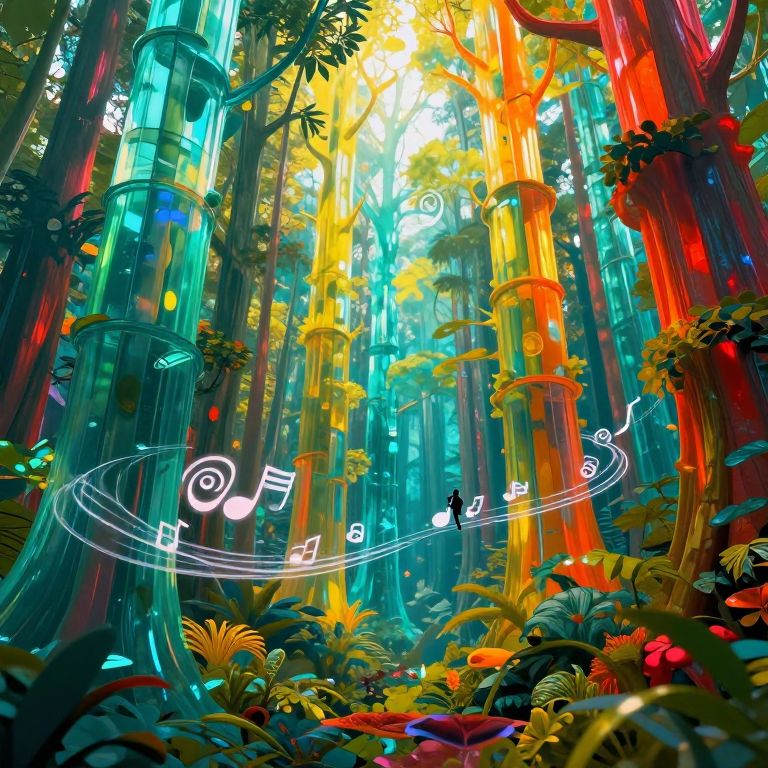 A vibrant, digital illustration of a fantastical forest filled with tall, colorful trees. The trees have glowing blue, green, and yellow hues, with swirling musical notes floating around them. Sunlight filters through the canopy, casting a warm, ethereal glow. The forest floor is lush with variously colored ferns and plants. A small, dark silhouette of a person stands in the mid-ground, adding a sense of scale. The overall style is whimsical and magical, with a rich, saturated color palette and a light, airy atmosphere.