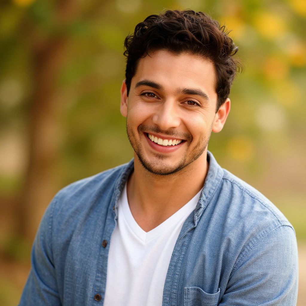 [[man,happy stock image]]Captivating, medium shot of a beaming man, exuding joy and contentment. He sports a bright, genuine smile, dressed in casual attire, amidst an idyllic outdoor setting bathed in warm, natural light. The vibrant colors surrounding him add depth and energy to the scene, capturing a candid moment that radiates happiness and serenity Man has masculine face and piercing eyes