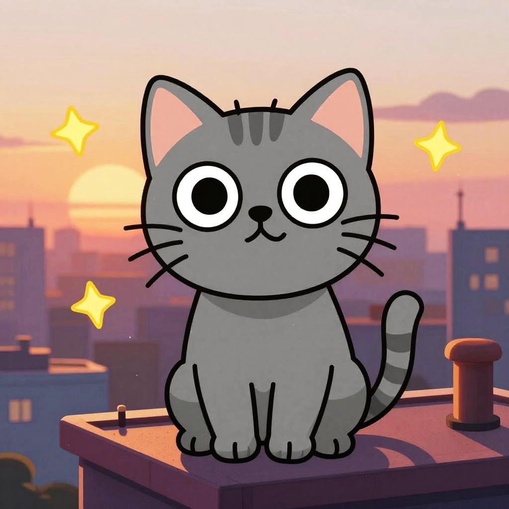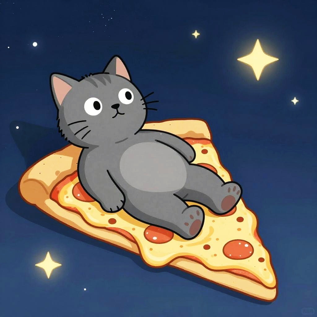 Grey cat cartoon lounging on a giant pizza slice under a starry night sky, quirky and fun scene, vibrant colors with surreal elements, playful and imaginative artwork