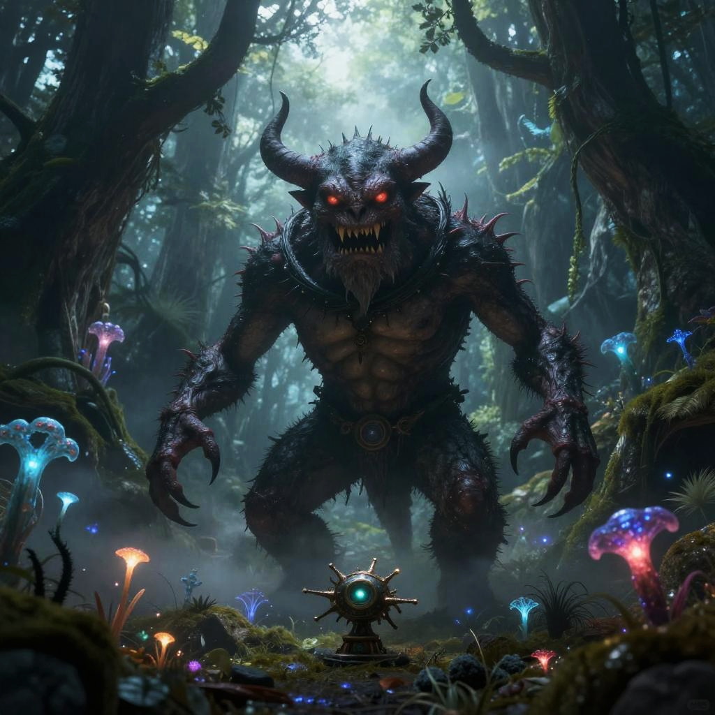 Monster generator AI, an ancient enchanted forest where a magic-powered device generates eerie monsters from ethereal mist, bioluminescent plants surrounding the scene, mystical atmosphere, fantasy art with glowing highlights and deep shadows