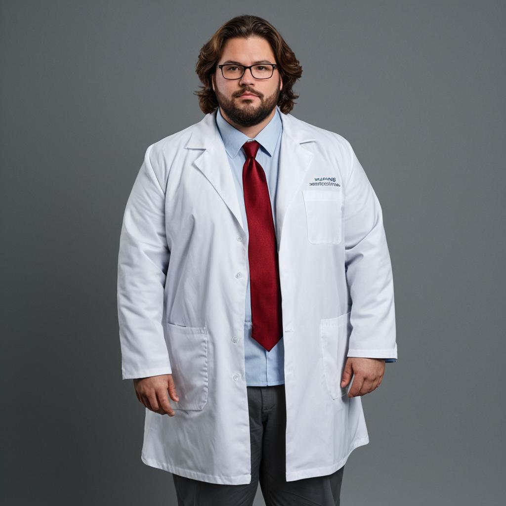 Portrait of a plus size male scientist wearing a white lab coat, light blue collared shirt, and a red necktie. He has medium-length brown hair, facial hair, and glasses. The scientist is standing against a simple grey background, looking directly at the viewer with a neutral expression.