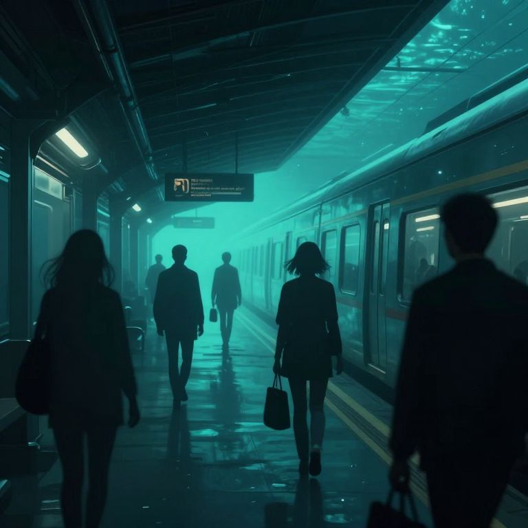 A cyberpunk-inspired digital artwork depicts a surreal train station glowing faintly beneath the ocean floor, where silhouetted passengers arrive as abstract shapes against a moody, teal-lit backdrop, evoking a sense of mystery and otherworldliness.