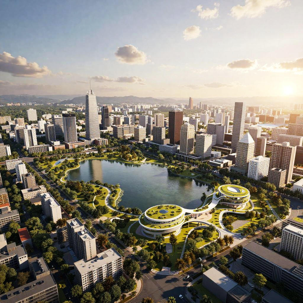 Urbandesign, lake, future, sunset, ((best quality)), ((masterpiece)), ((realistic)), Visualize an aerial view capturing the essence of modern urban planning and design. Showcase the strategic process of integrating various elements and harmonizing them within a sustainable city layout. The scene should reflect an urban environment with mixed-use developments, emphasizing the incorporation of green infrastructure. Utilize natural, balanced lighting to create a warm and inviting atmosphere. The artwork should be inspired by the contemporary urban architecture style of Norman Foster, employing architectural visualization as the medium. Employ a vibrant color scheme with earthy tones and pops of green to highlight the progressive nature of the urban design. Utilize 3D rendering and visual effects to achieve a high-definition, 4K quality artwork that immerses viewers in the intricate details and thoughtful planning of this modern urban landscape on eye level