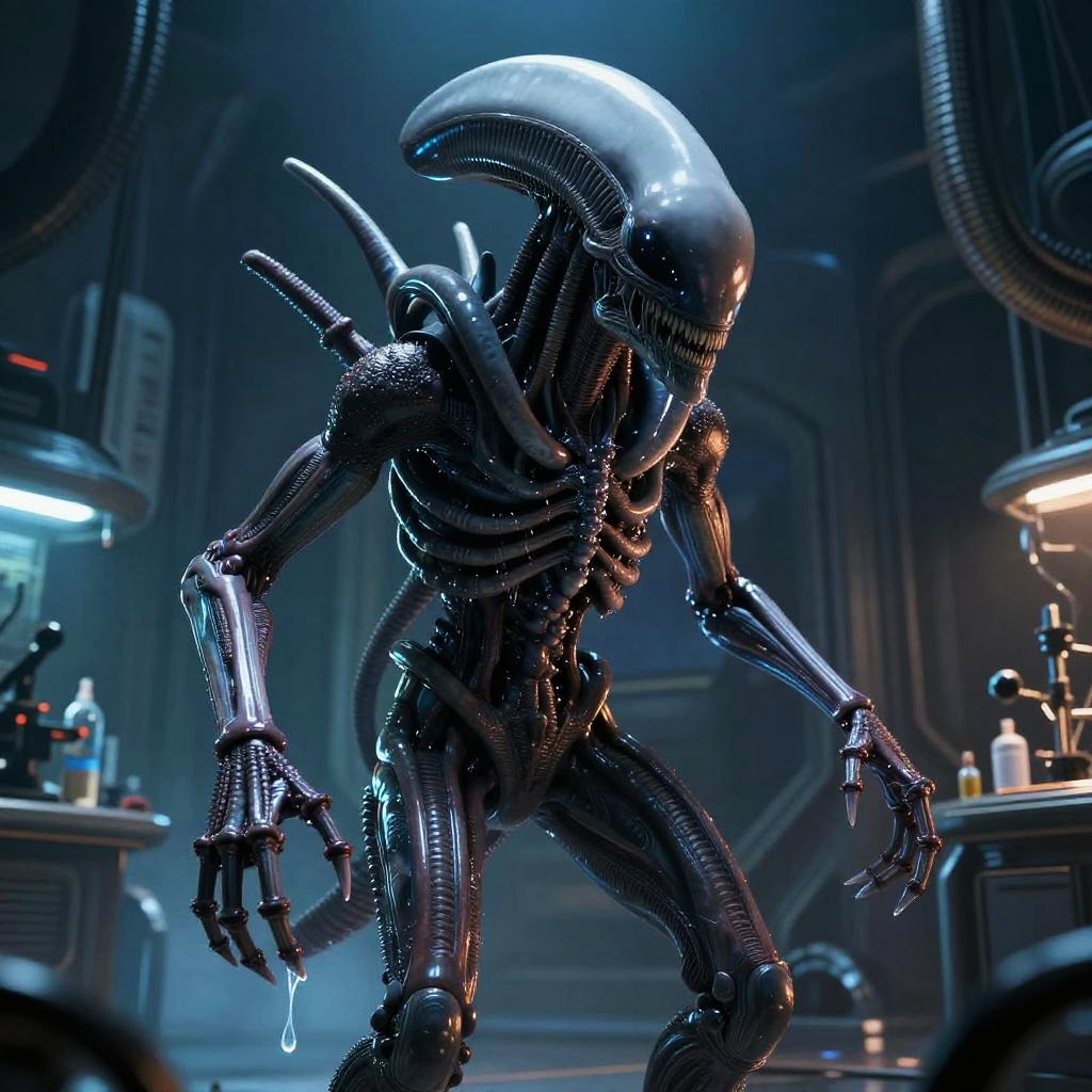 Xenomorph transformation in a dark sci-fi biomechanical lab, glowing alien fluids dripping, seamless blend of human and alien features, intense atmosphere, cinematic lighting