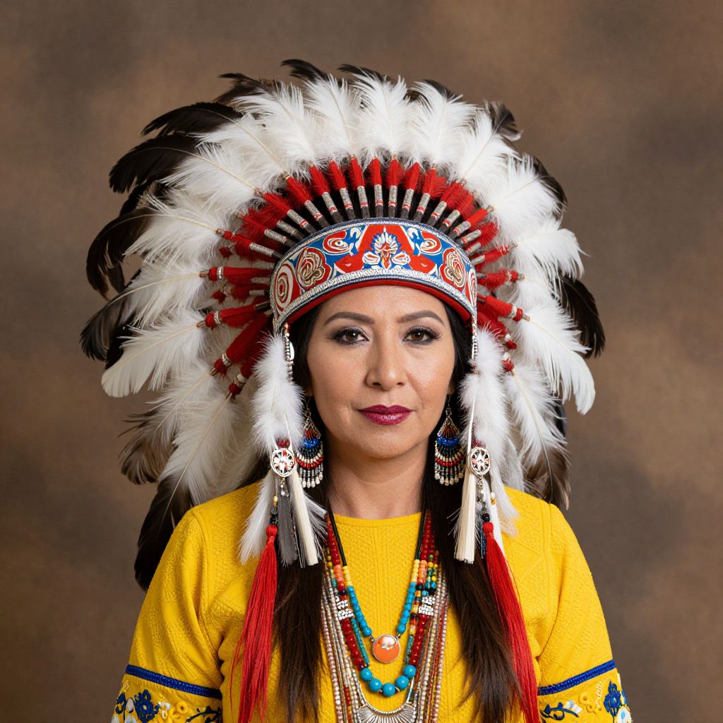 Photograph of a woman with medium brown skin and black hair, wearing a traditional Native American headdress adorned with white, black, and red feathers, and intricate beadwork. She has dark eyes, wears red lipstick, and is dressed in a bright yellow shirt with blue and red patterns on the sleeves. Multiple beaded necklaces hang around her neck. The background is a textured brown, providing contrast to her vibrant attire. Her expression is calm and composed.