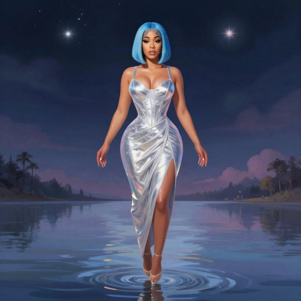 Cardi B blue hair flowing in the wind, sitting on a throne made of colorful flowers and crystals, mystical forest background with soft glowing lights, ethereal vibe combined with modern hip-hop elements, watercolor and ink blend with vibrant hues.