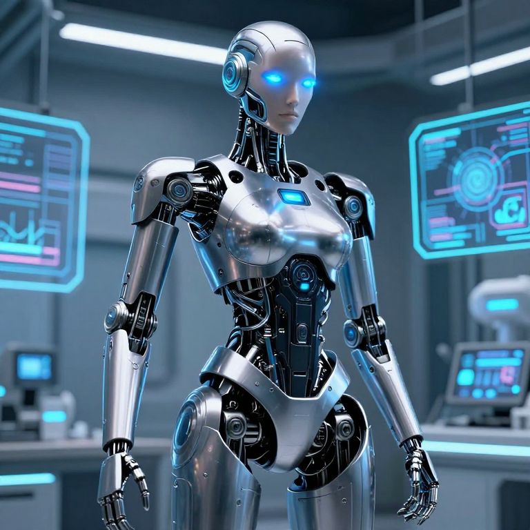 A futuristic female humanoid robot with a sleek metallic surface and glowing blue eyes stands in a high-tech laboratory. The robot features intricate mechanical joints and detailed cybernetic anatomy, surrounded by neon lights and holographic displays, creating a sci-fi atmosphere.