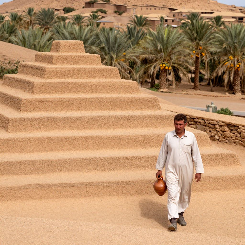 A stepped pyramid structure built into a hillside in a remote Moroccan village, surrounded by orange date palms and sun-drenched earth, a middle-aged man with brown hair and calm eyes walking beside it, holding a clay water pot, photographed with warm natural light and earthy textures.