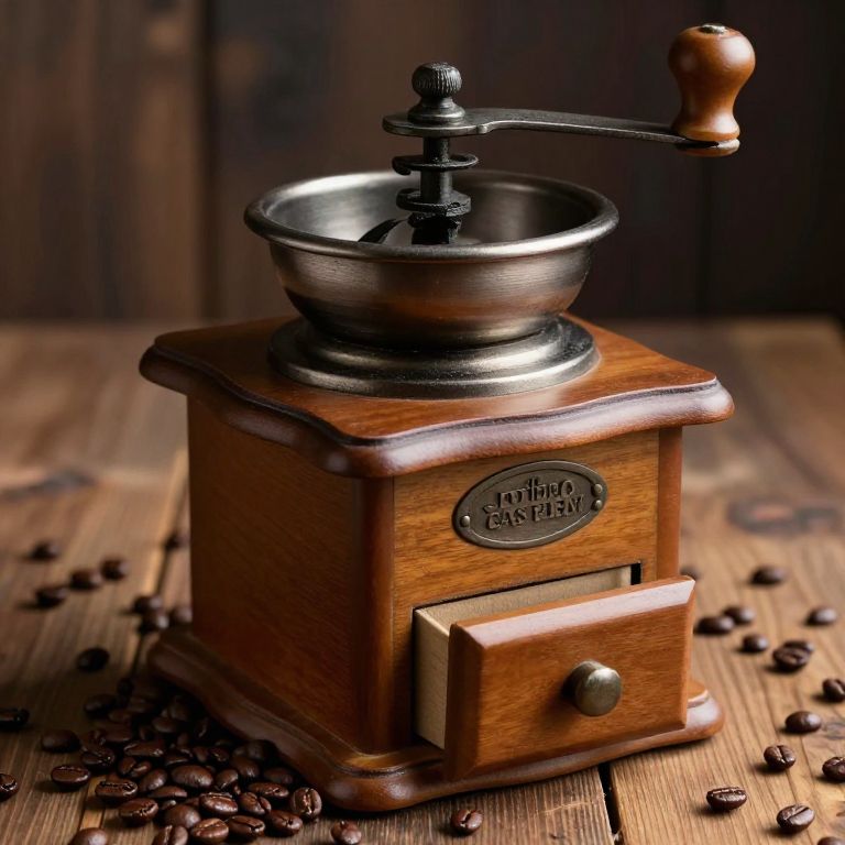 A rustic coffee mill, crafted in a vintage style with wooden and metallic accents, sits atop a wooden surface surrounded by scattered coffee beans, captured in a high-definition, photorealistic stock photo that evokes a cozy, artisanal atmosphere.
