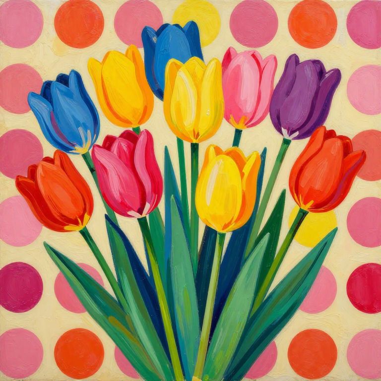 Pop art flower painting showcasing a bouquet of tulips rendered in bright primary colors, sharp contrasts, and a repetitive pattern background, evoking 1960s retro aesthetic