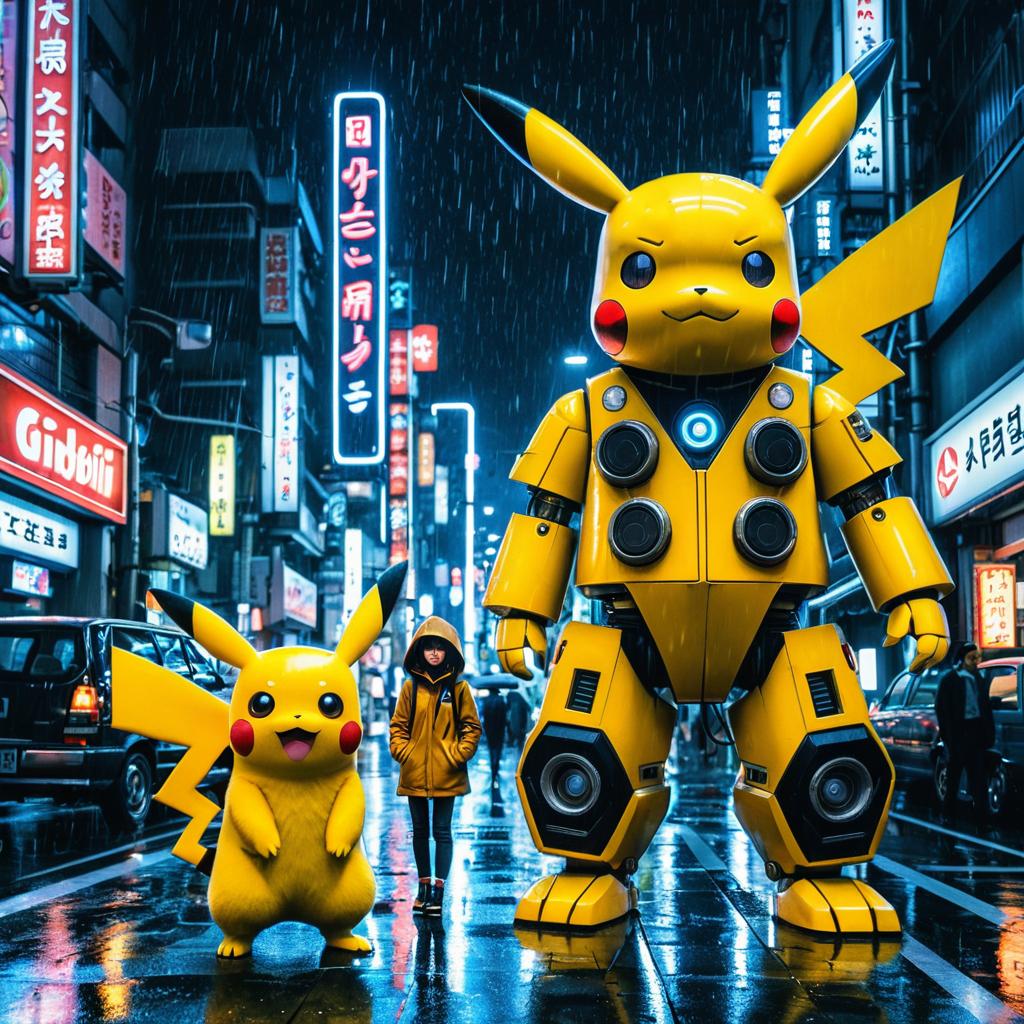 Full body character fusing Pokemon Pikachu and a Vintage Robot, standing in rainy neon Tokyo street at midnight, trending on ArtStation, digital painting in retro futuristic anime meets Studio Ghibli, 8K HDR, shallow depth of field, Kodak film grain, volumetric lighting, subsurface scattering, photorealistic, Octane render, extreme details.